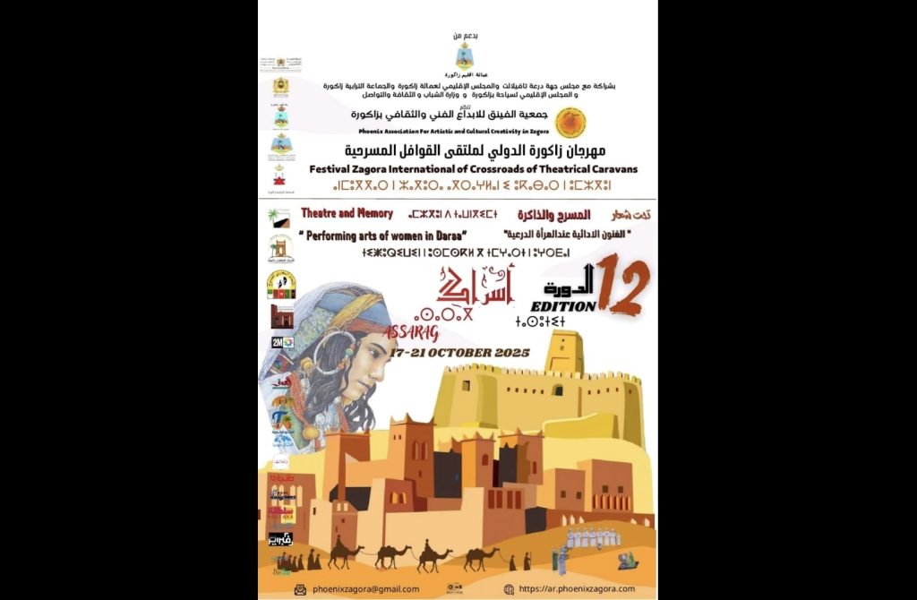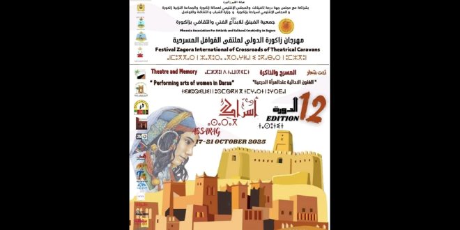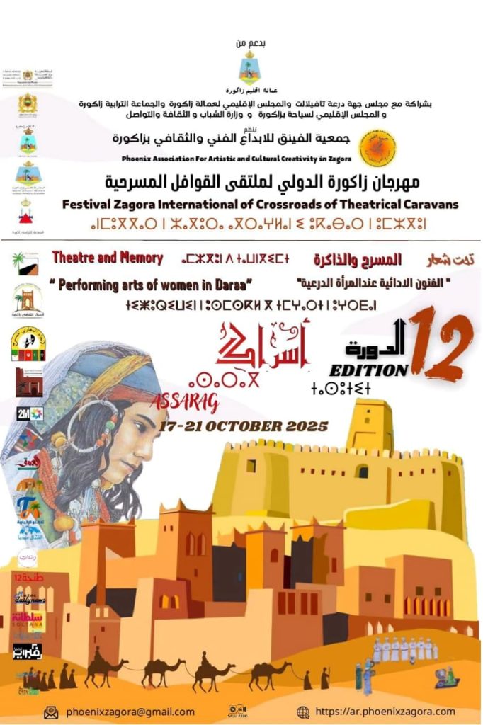 اعلنت جمعية الفنيق للإبداع الفني والثقافي بزاكورة، في بلاغ صحفي رسمي، عن تنظيم الدورة الثانية عشرة من “مهرجان زاكورة الدولي لملتقى القوافل المسرحية – أسرّاك”، وذلك خلال الفترة الممتدة من 17 إلى 21 أكتوبر 2025، تحت شعار “الفنون الأدائية عند المرأة الدرعية”.