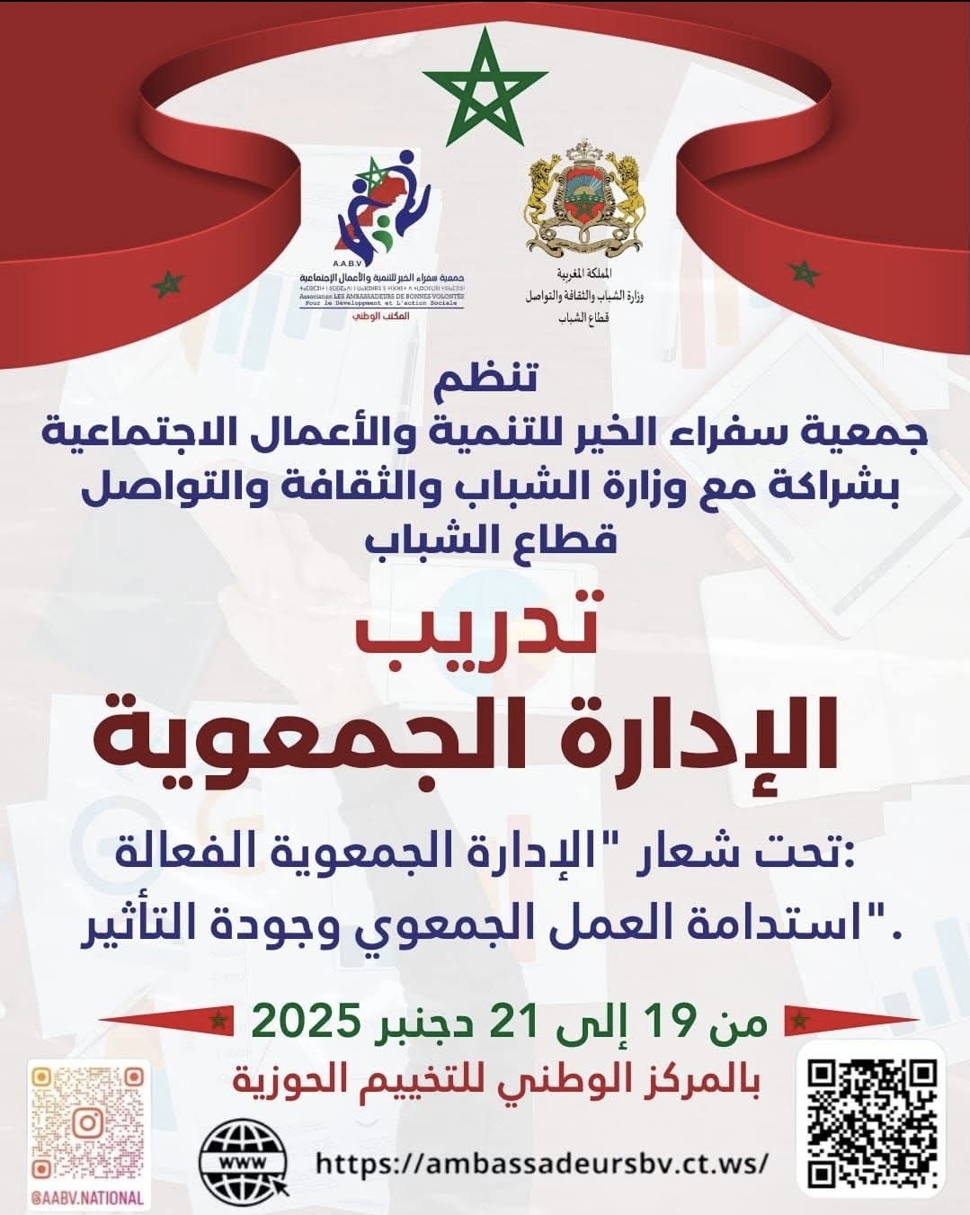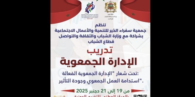 تنظم جمعية سفراء الخير للتنمية والأعمال الاجتماعية، بشراكة مع وزارة الشباب والثقافة والتواصل – قطاع الشباب، دورة تدريبية متخصصة بالمركز الوطني للتخييم الحوزية، خلال الفترة ما بين 19 و21 دجنبر الجاري، تحت شعار “الإدارة الجمعوية الفعالة: استدامة العمل المدني وجودة التأثير”.