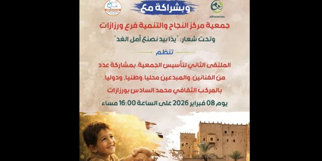 ورزازات | تنظم جمعية ابتسام لرعاية الأيتام بورزازات، بشراكة مع جمعية مركز النجاح والتنمية بورزازات، يوم الأحد 8 فبراير 2026، فعاليات الملتقى الثاني لتأسيس جمعية ابتسام لرعاية الأيتام، وذلك تحت شعار “يدا بيد نصنع أمل الغد”، بالقاعة الكبرى للمركب الثقافي محمد السادس بورزازات، ابتداءً من الساعة الرابعة والنصف بعد الزوال.