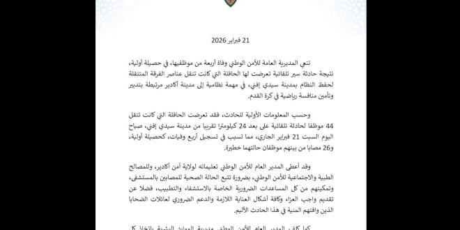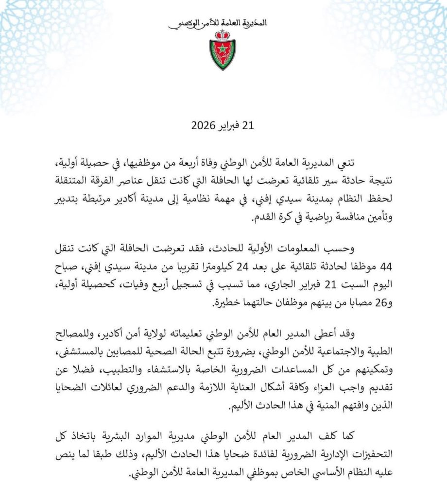 وقد أسفر الحادث، وفق حصيلة أولية، عن وفاة أربعة موظفين، وإصابة 26 آخرين، من بينهم حالتان وُصفتا بالخطيرتين، ما خلف حالة من الحزن والأسى في صفوف أسرة الأمن الوطني وعموم ساكنة الإقليم.