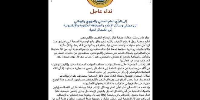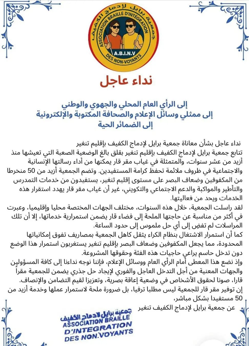 تنغير | في نداء يحمل الكثير من المرارة والاستعجال، دقّت جمعية برايل لإدماج الكفيف بتنغير ناقوس الخطر بشأن وضعية اعتبرتها “غير قابلة للاستمرار”، بعد أزيد من عشر سنوات من الانتظار دون التوصل إلى مقر قار يضمن استقرار خدماتها لفائدة المكفوفين وضعاف البصر بالإقليم.