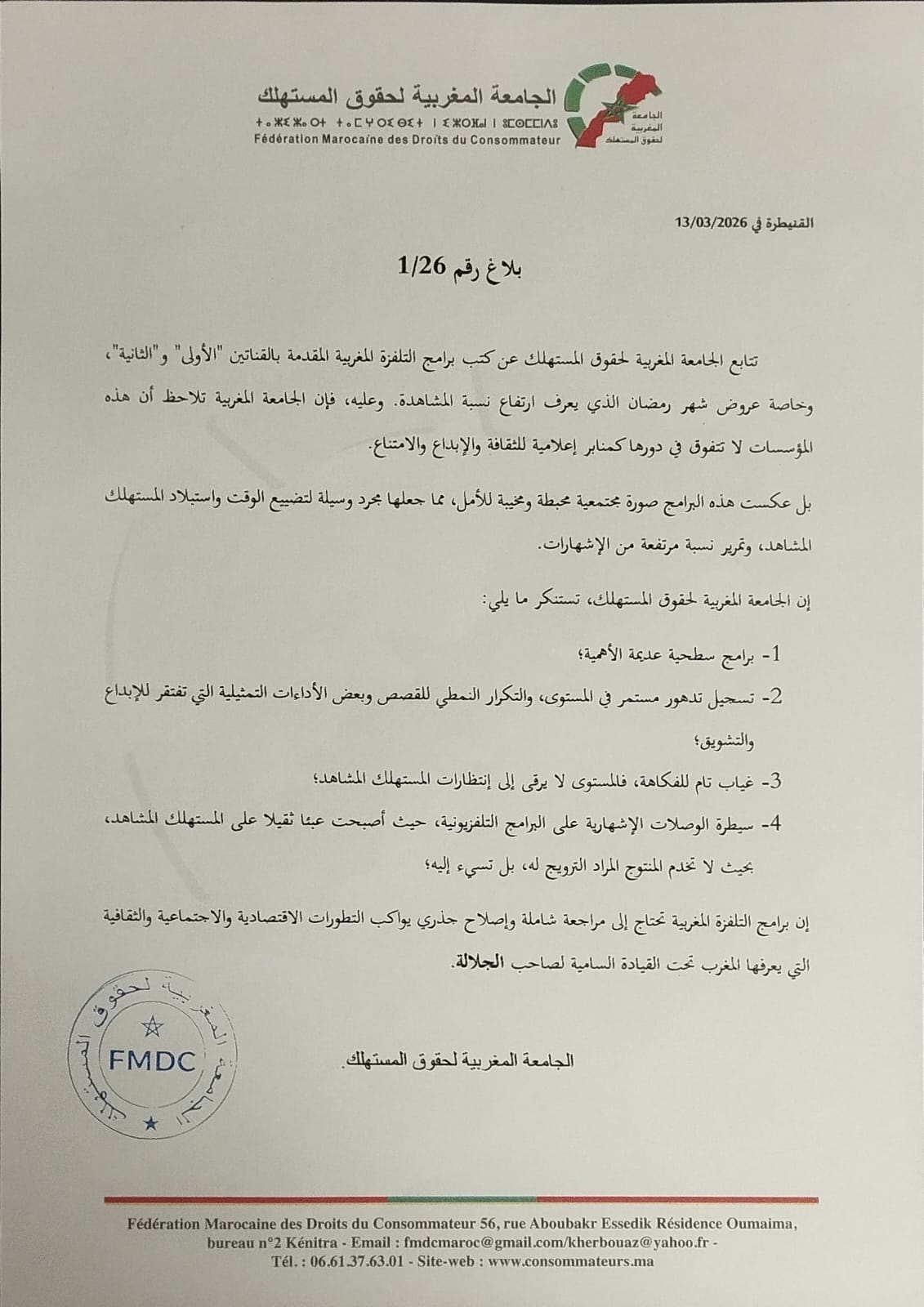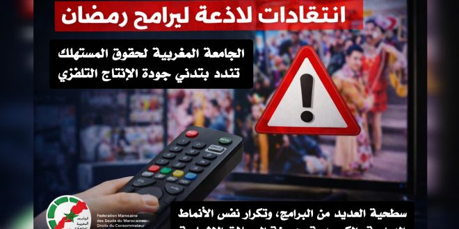 أعربت الجامعة المغربية لحقوق المستهلك عن استيائها الشديد من مستوى البرامج التلفزية التي تبثها القناتان العموميتان القناة الأولى المغربية والقناة الثانية دوزيم خلال شهر رمضان، معتبرة أن عددا كبيرا منها لا يرقى إلى انتظارات المشاهد المغربي ولا يعكس الدور الثقافي والإعلامي المنوط بالإعلام العمومي.