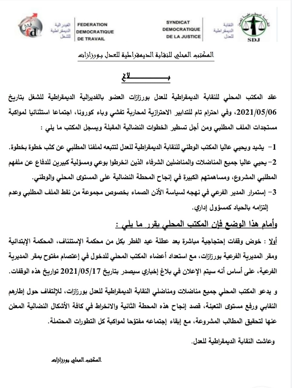 وأمام هذا الوضع يفيد البلاغ، إن المكتب المحلي الذي يعتبر عضوا بالفديرالية الديمقراطية للشغل قرر في البداية خوض وقفات إحتجاجية مباشرة بعد عطلة عيد الفطر بكل من محكمة الإستئناف، والمحكمة الإبتدائية ومقر المديرية الفرعية بورزازات، مع استعداد أعضاء المكتب المحلي للدخول في إعتصام مفتوح بمقر المديرية الفرعية، على أساس أنه سيتم الإعلان في بلاغ إخباري سيصدر بتاريخ 17/05/2021 تواريخ هذه الوقفات.