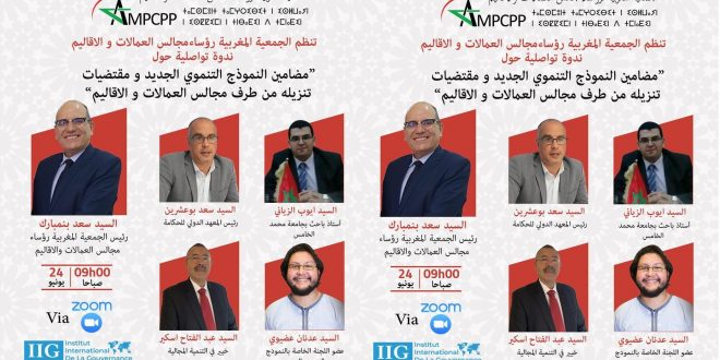 تنظم الجمعية المغربية لرؤساء مجالس العمالات والأقاليم بالرباط، يوم الخميس 24 يونيو 2021 بمقر الجمعية، في احترام تام للتدابير الاحترازية للوقاية من كوفيد 19، ندوة علمية لمناقشة مضامين وخلاصات النموذج التنموي الجديد وكيفية تفعيل مضامينه داخل مجالس العمالات والأقاليم وآفاق تنزيل مقتضياته تماشيا مع توجهات صاحب الجلالة الملك محمد السادس.