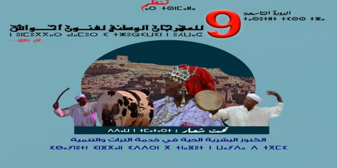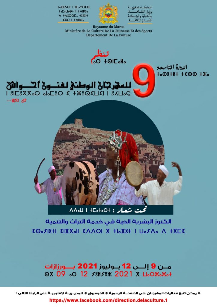 سعيا منها إلى الحفاظ على التراث الثقافي اللامادي وتقريبه من الجمهور وخصوصا فئات الشباب والأطفال، تنظم وزارة الثقافة والشباب والرياضة -قطاع الثقافة- عبر منصات ومواقع التواصل الاجتماعي، الدورة التاسعة للمهرجان الوطني لفنون أحواش، تحت شعار: ”الكنوز البشرية الحية في خدمة التراث والتنمية” في الفترة الممتدة من 09 إلى 12 يوليوز 2021 بمدينة ورزازات.