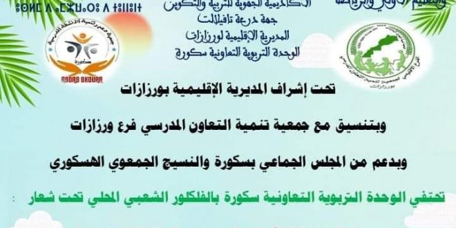 بدعم من الجماعة الترابية بسكورة والنسيج الجمعوي الهسكوري وتحت إشراف المديرية الإقليمية وبتنسيق مع الفرع الإقليمي لجمعية تنمية التعاون المدرسي بورزازات وجمعية دعم وتنمية الأنشطة المدرسية بورزازات ستنظم الوحدة التربوية التعاونية سكورة صبحية تربوية احتفاء بالفلكلور المحلي تحت شعار “ترسيخ الموروث الثقافي الهسكوري لدى الناشئة التعليمية … حماية للهوية وتعزيز للانتماء”، ىمشاركة فرق الفنون الشعبية المحلية التابعة للمؤسسة.