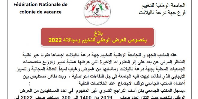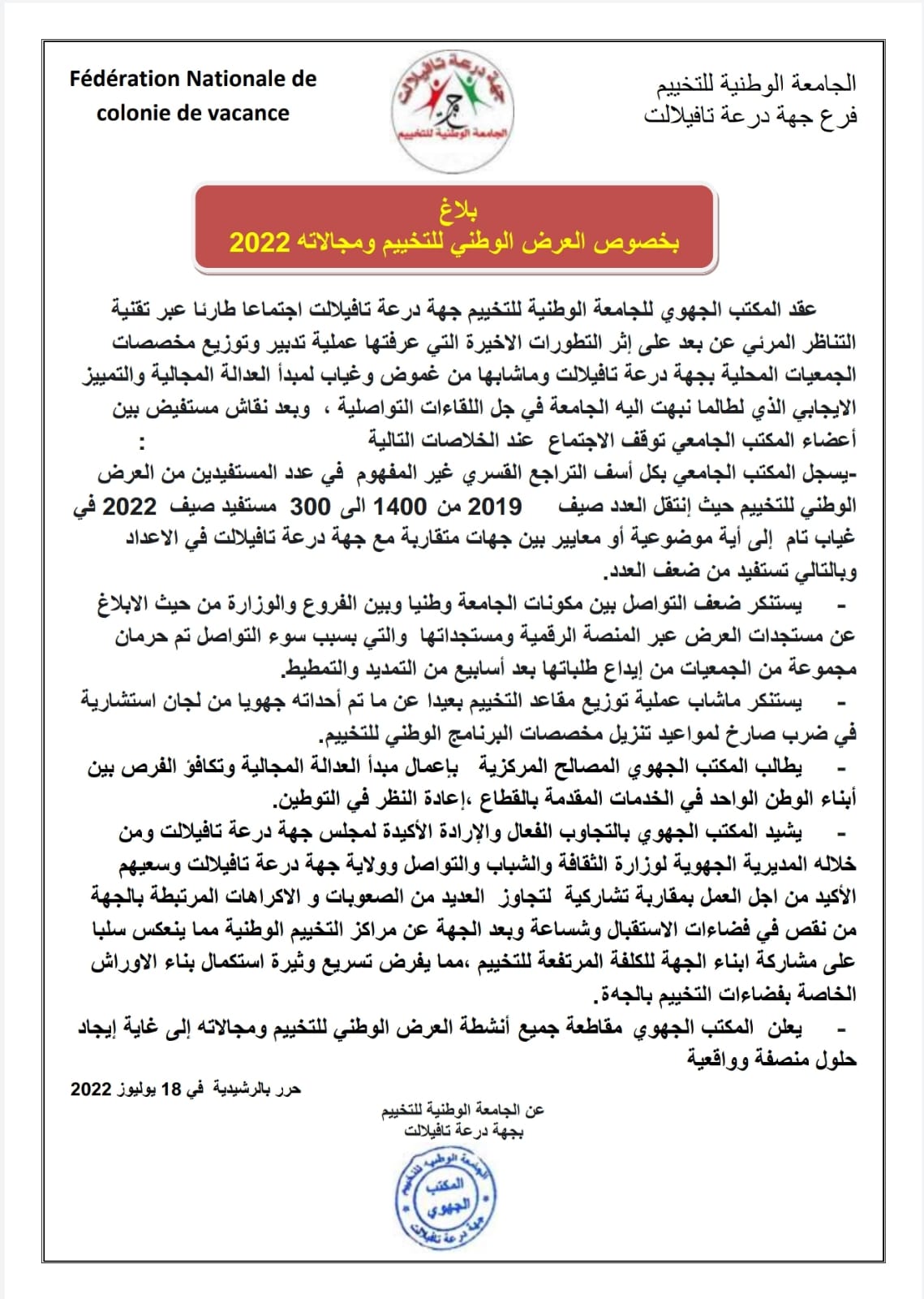 أعلن، المكتب الجهوي للجامعة الوطنية للتخييم جهة درعة تافيلالت في بلاغ صادر عنه توصلت بالجريدة بنسخة منه، مقاطعة جميع أنشطة العرض الوطني للتخييم ومجالاته إلى غاية إيجاد حلول منصفة وواقعية.