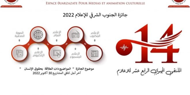 استعدادا لتنظيم الدورة 14 للملتقى الجهوي للاعلام والمزمع تنظيمه في غضون شهر نونبر 2022 و رغبة في تشجيع الطاقات المشتغلة في مجال الإعلام المحلي المجتمعي ارتأت الدورة 14 لملتقى الجهوي للإعلام تخصيص هذه الجائزة للإنتاجات التي تم نشرها خلال سنة 2022 وفي موضوع ” حقوق الإنسان ‘ وتماشيا مع جعل الدورة ملتقا منفتحا على ماهو وطني ورغبة توسيع فضاء التنافسية فإن الجائزة هي الأخرى ستتخد بعدا وطنيا ومنفتحة على المنابر الجمعوية الوطنية وتشمل كل فعاليات الإعلام المحلي بالجنوب الشرقي وعلى الصعيد الوطني:
