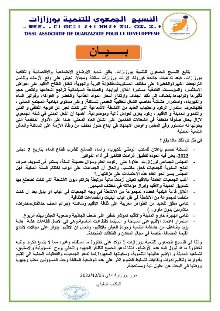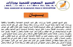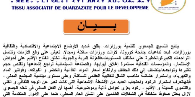 افاد، بيان للنسيج الجمعوي للتنمية بورزازات، أن مكونات النسيج الجمعوي يتابعون بقلق شديد الأوضاع الاجتماعية والاقتصادية والثقافية بورزازات،