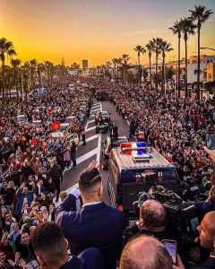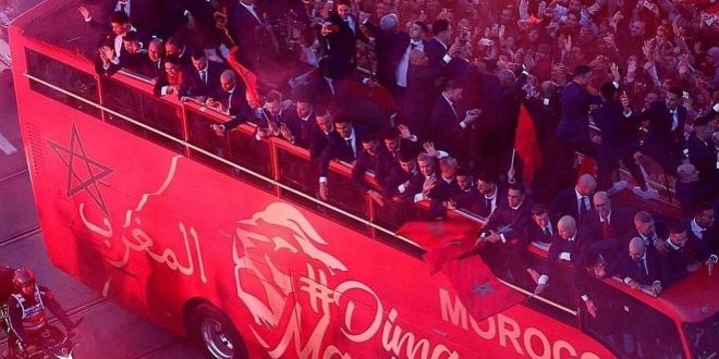 وبعد طول الانتظار الممزوج بمشاعر الشوق للحظة الموعودة، ظهر الأسود في الأفق وهم يهمون بالصعود للحافلة المكشوفة المجهزة لهذه المناسبة، في ظل أجواء حماسية مطبوعة بمزيج من الزغاريد والهتافات والشعارات التي تمجد المنتخب الوطني وأدائه التاريخي. وحظي الفريق الوطني باستقبال شعبي وجماهيري كبير، على طول شارع الحسن الثاني، وساحة 16 نونبر، وساحة شالة، وساحة الملك حسين ثم شارع محمد الخامس، وساحة البريد، وساحة محمد الخامس، وساحة 11 يناير، وشارع مولاي الحسن، وباب السفراء، وصولا إلى القصر الملكي العامر، حيث سيحظى أعضاء المنتخب الوطني باستقبال ملكي سامي احتفاء وتقديرا بهذا الإنجاز التاريخي العظيم.