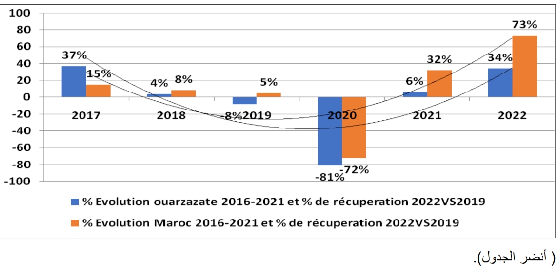ولازال القطاع السياحي بورزازات يعيش على وقع التراجعات المقلقة، ومن المنتظر ان يتم تسجيل تراجع إجمالي قد يصل إلى ناقص 64 في المائة برسم حجم ليالي المبيت خلال سنة 2022 مقارنة مع سنة 2019 علما أن الاحصاءيات الرسمية المتوفرة إلى حدود 10 أشهر الأولى من 2022 تشير إلى نسبة تراجع وصلت الى ناقص 65 في المائة بالنسبة لعدد الوافدين و ناقص 61 في المائة بالنسبة لليالي المبيت المسجلة بالمؤسسات السياحية المصنفة مقارنة مع نفس الفترة من سنة 2019 .