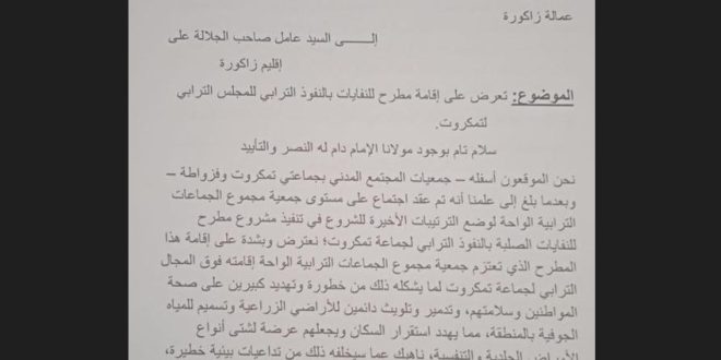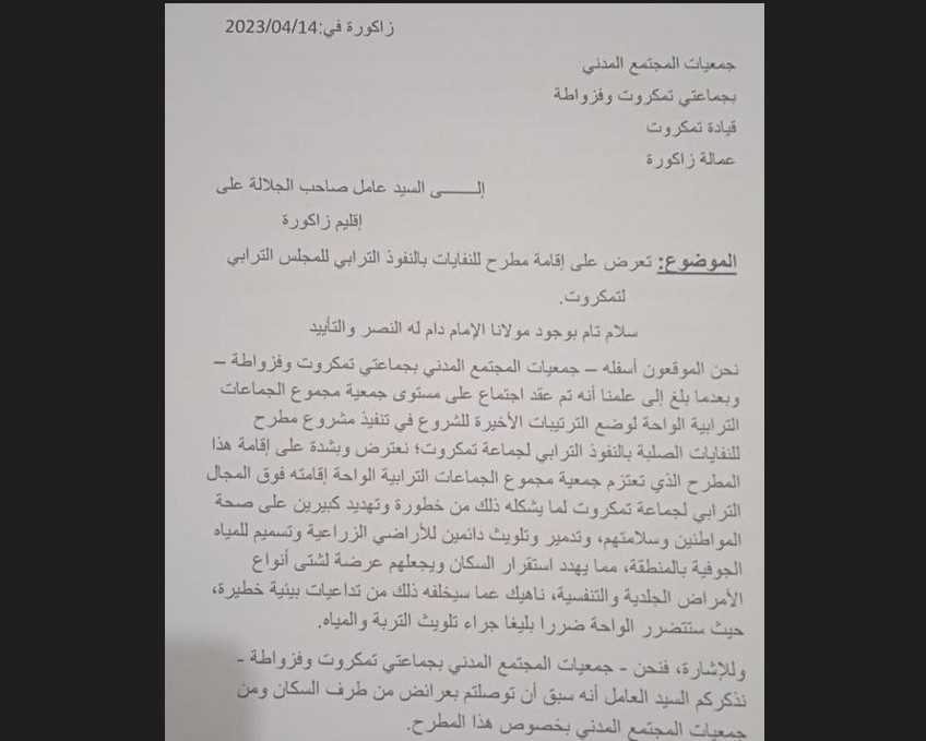 زاكورة│تقدمت ساكنة تمكروت وجمعيات المجتمع المدني بالنفوذ الترابي لقيادة تمكروت مؤخرا بتعرض إلى عامل إقليم زاكورة فؤاد حجي، لإقامة المطرح المراقب بتراب القيادة لما سيشكله من خطر بيئي يتهدد الساكنة.