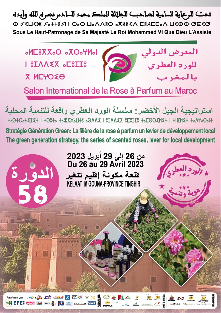 تنغير – يحتضن إقليم تنغير الدورة 58 للمعرض الدولي للورد العطري ببقلعة مكونة جنوب المملكة المغربية تحت شعار ” استراتيجية الجيل الأخضر: سلسلة الورد العطري رافعة للتنمية المحلية”، تحت الرعاية السامية لصاحب الجلالة الملك محمد السادس نصره الله.