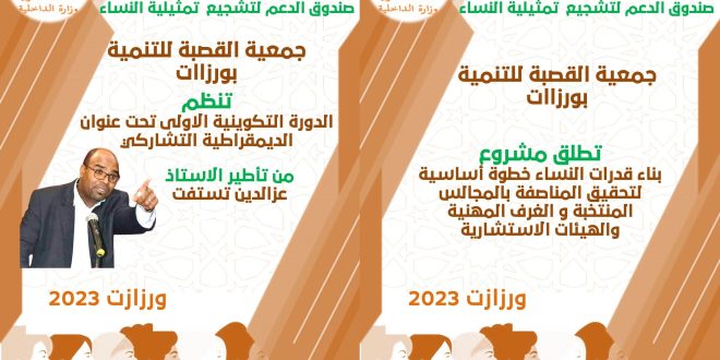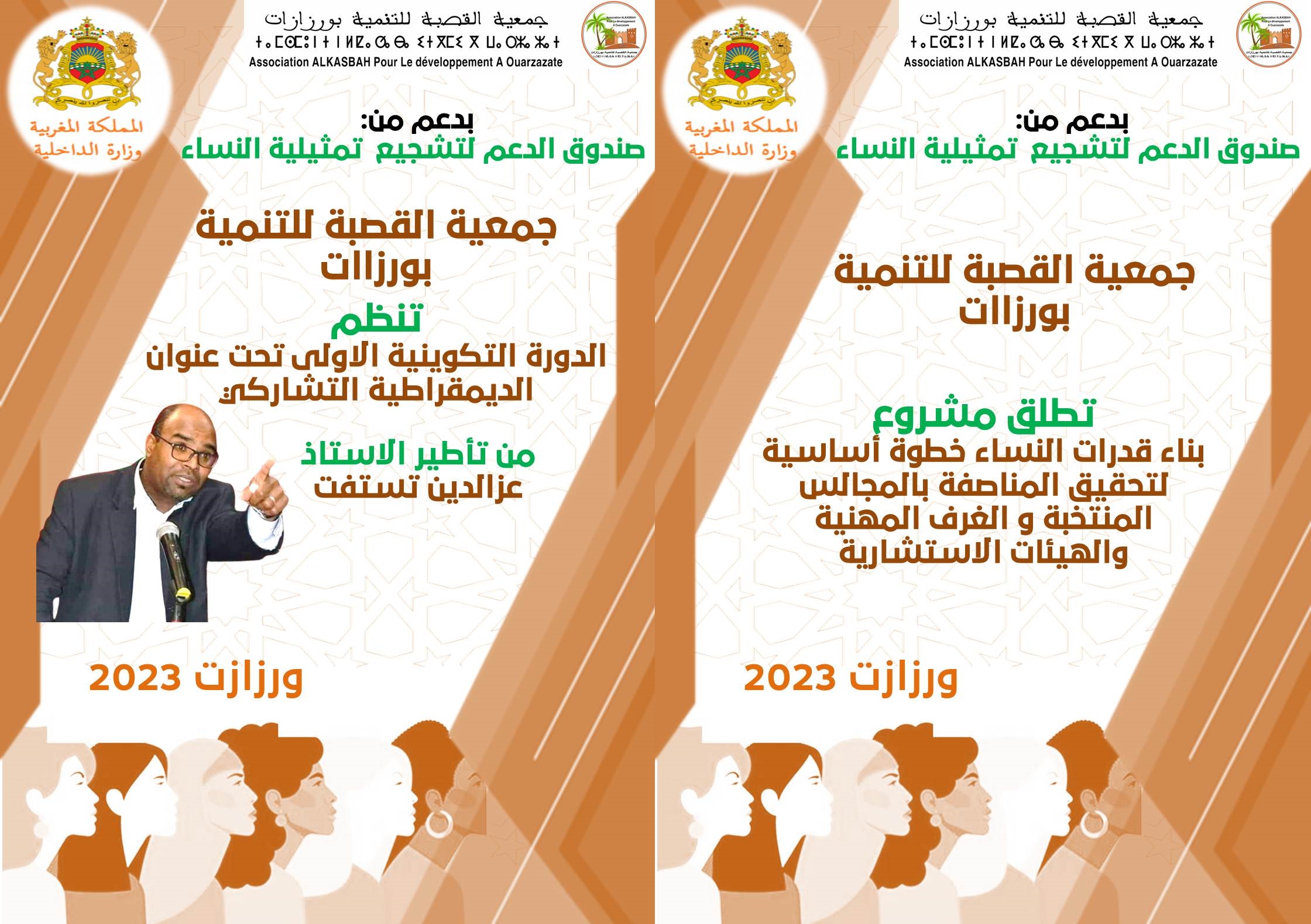 ورزازات – تستعد جمعية القصبة للتنمية بورزازات، بشراكة مع وزارة الداخلية (صندوق الدعم لتشجيع التمثيلية النسائية) لاعطاء الانطلاقة لـ ” برنامج تعزيز مشاركة المرأة في الحياة السياسية،وفي تدبير الشأتن المحلي “، تحت شعار ” بناء قدرات النساء خطوة أساسية لتحقيق المناصفة بالمجالس المنتخبة و الغرف المهنية والهيئات الاستشارية” بداية من شهر ماي الجاري الى غاية شهر اكتوبر 2023.
