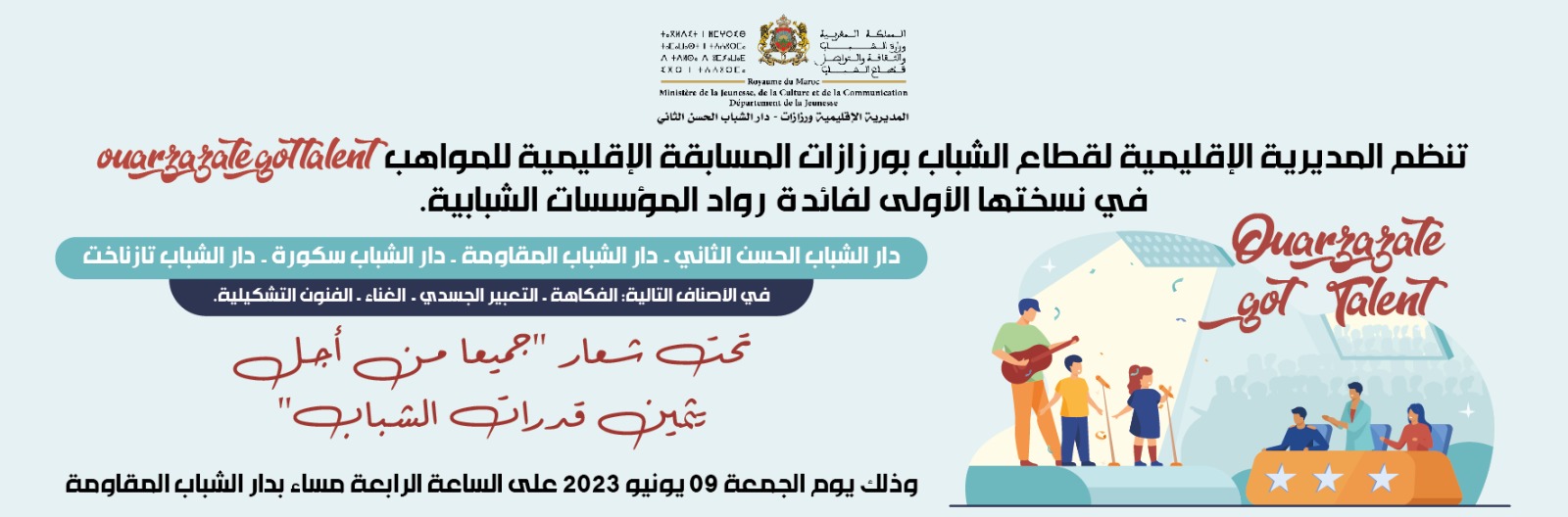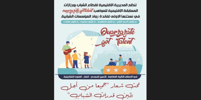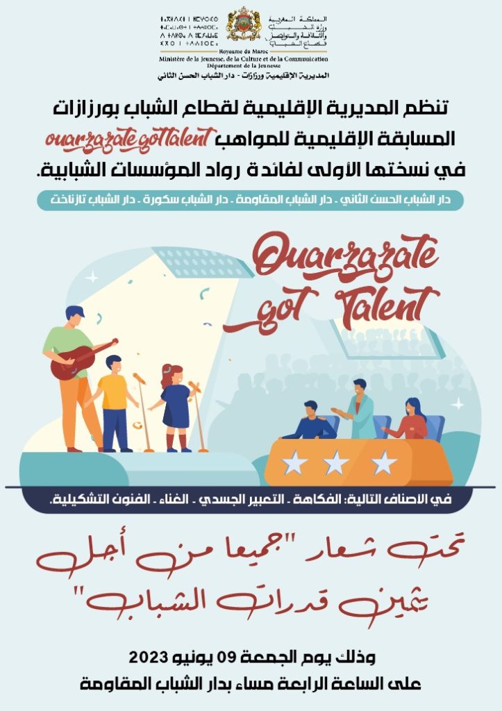 ورزازات – تنظم المديرية الإقليمية لقطاع الشباب بورزازات نهائيات المسابقة الإقليمية للمواهب ouarzazate got talent في نسختها الأولى لفائدة رواد المؤسسات الشبابية، وذلك يوم الجمعة 09 يونيو 2023 على الساعة الرابعة مساءا بدار الشباب المقاومة، تحت شعار “جميعا من أجل تثمين قدرات الشباب” بكل من دار الشباب الحسن الثاني، دار الشباب المقاومة، دار الشباب سكورة، ودار الشباب تزنخات.