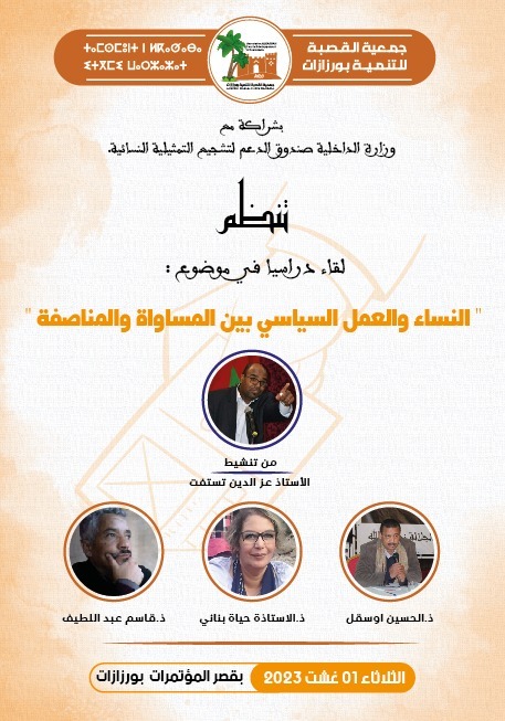 كما ستنظم يوما دراسيا حول :” النساء والعمل السياسي بين المساواة والمناصفة “يوم 01/08/2023 بقصر المؤتمرات بورزازات .