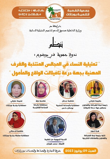 ورزازات – تنظم جمعية القصبة للتنمية بورزازات بشراكة مع وزارة الداخلية صندوق الدعم لتشجيع التمثيلية النسائية، ندوة جهوية في موضوع ” تمثيلية النساء في المجالس المنتخبة والغرف المهنية بجهة درعة تافيلالت الواقع والمأمول “تحت شعار بناء قدرات النساء خطوة أساسية لتحقيق المناصفة بالمجالس المنتخبة و الغرف المهنية “، وذلك يوم 29/07/2023 بغرفة التجارة والصناعة والخدمات.