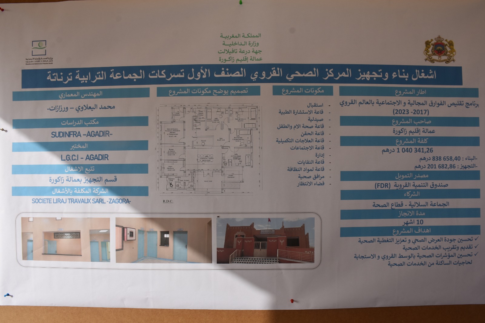 زاكورة – تم يومي 30 و 31 غشت، بإقليم زاكورة، تدشين مركزين صحيين من الصنف الأول بكل من دوار تسركات بجماعة ترناتة ، ودوار بوزركان بجماعة بني زولي بغلاف مالي قدره 2 مليون درهم بتمويل من صندوق التنمية القروية، وذلك في إطار تحسين جودة العرض الصحي وتأهيل البنية التحتية الصحية بالإقليم.