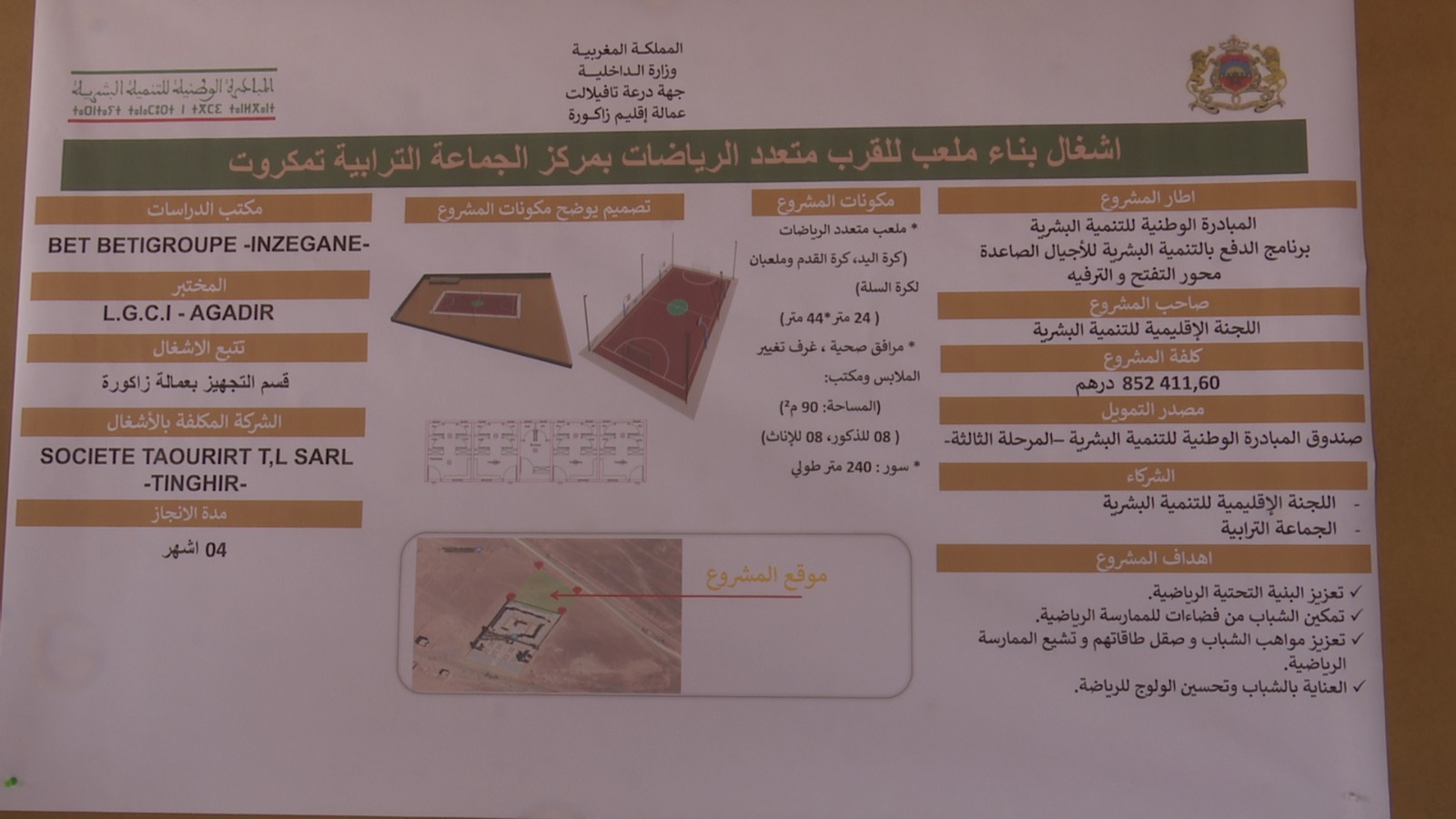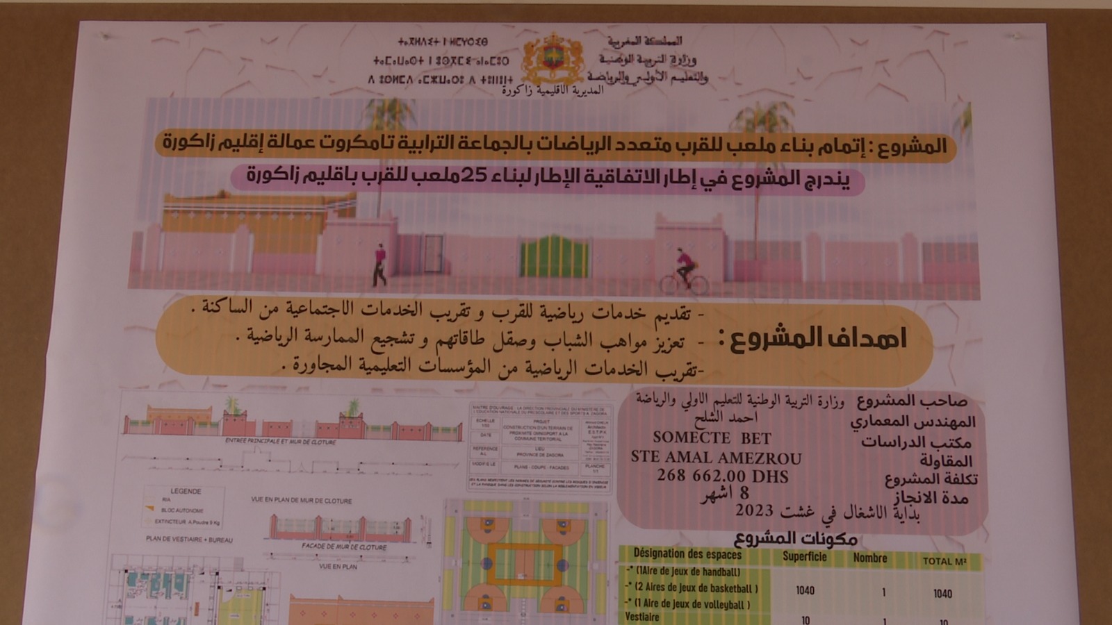 وفي إطار تعزيز البنيات التحتية الرياضية، وتجويد فضاءات الممارسة الرياضية تم إعطاء انطلاقة أشغال بناء خمس ملاعب للقرب بكل من جماعات بني زولي وتفتشنا والنقوب وأيت ولال وتمكروت ، بغلاف مالي فاق 3 ملايين درهم ، بتمويل من وزارة التربية الوطنية والتعليم الأولي والرياضة في إطار الاتفاقية الإطار لبناء 25 ملعبا للقرب باقليم زاكورة.