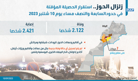 الرباط – أعلنت وزارة الداخلية، في بلاغ اليوم الأحد، عن استقرار الحصيلة المؤقتة للزلزال الذي شهدته بعض عمالات وأقاليم المملكة يوم 8 شتنبر الجاري، في وفاة 2122 شخصا، وإصابة 2421 شخصا بجروح، وذلك إلى حدود الساعة السابعة والنصف مساء.
