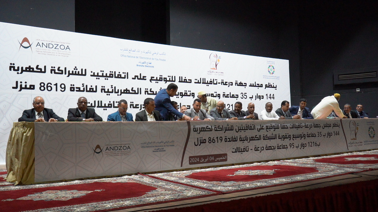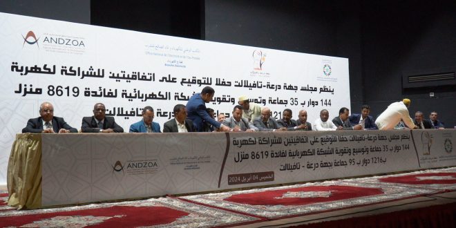 وتتعلق الاتفاقية الأولى، التي تجمع كل من المديرية العامة للجماعات الترابية ومجلس جهة درعة تافيلالت والمكتب الوطني للكهرباء والماء الصالح للشرب قطاع الكهرباء، والوكالة الوطنية لتنمية مناطق الواحات وشجر الأركان، والجماعات الترابية المعنية، بكهربة 2770 منزل ب 144 دوار بـ 35 جماعة ترابية بمختلف أقاليم جهة درعة تافيلالت، بمبلغ إجمالي يتجاوز 119 مليون درهم.