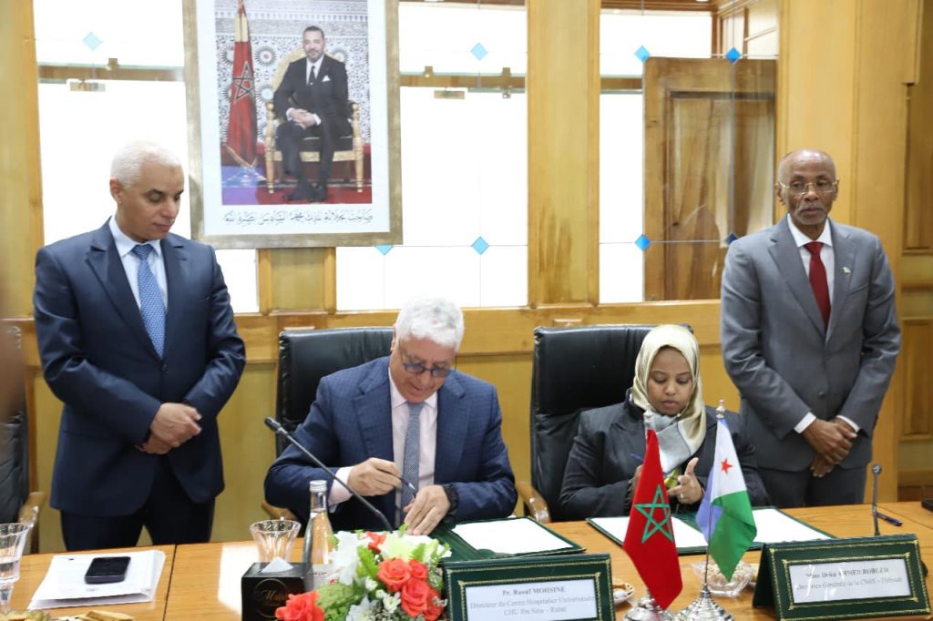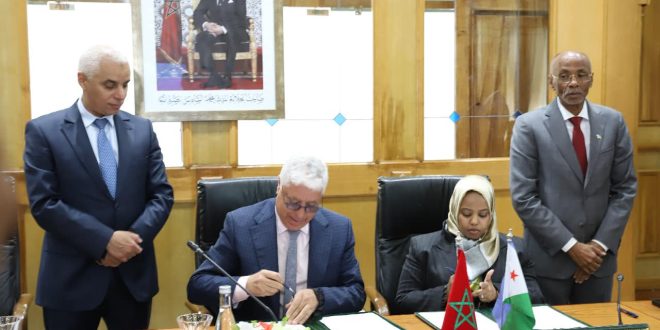 الرباط، الجمعة 26 أبريل 2024 l ترأس وزير الصحة والحماية الاجتماعية البروفيسور خالد ايت طالب بمعية وزير العمل المكلف بالحماية الاجتماعية بجيبوتي، السيد عمر عبدي سعيد، بحضور السيد المدير العام للمركز الاستشفائي الجامعي بالرباط، ومديرة الصندوق الوطني للضمان الاجتماعي بجيبوتي، مراسيم التوقيع على مذكرتي تفاهم بين المملكة المغربية وجيبوتي في مجالي الصحة والحماية الاجتماعية.