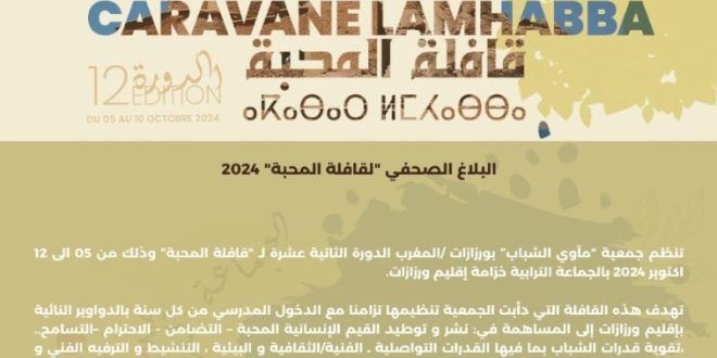 تنظم جمعية “مآوي الشباب” بورزازات، الدورة الثانية عشرة لـ “قافلة المحبة” من 05 الى 12 اكتوبر 2024 بالجماعة الترابية خزامة إقليم ورزازات.