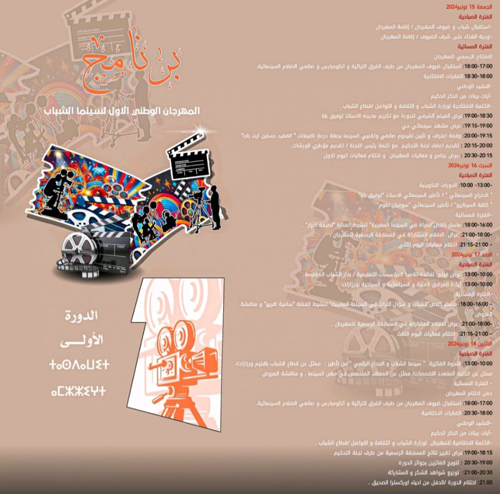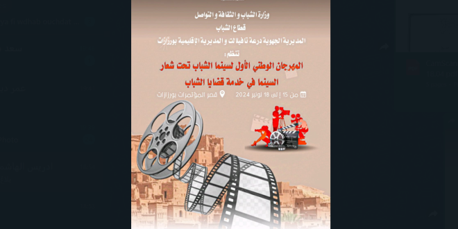 تنظم وزارة الشباب والثقافة والتواصل – قطاع الثقافة، في الفترة من 15 إلى 18 نونبر الجاري، الدورة الأولى للمهرجان الوطني لسينما الشباب، بمدينة ورزازات، تحت شعار “السينما في خدمة قضايا الشباب”.