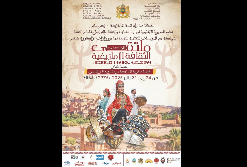 تنفيذا للأمر الملكي السامي لصاحب الجلالة الملك محمد السادس حفظه الله بإقرار رأس السنة الأمازيغية – إيض إيناير- عيدا وطنيا، وبدعم من وزارة الشباب والثقافة والتواصل – قطاع الثقافة – وبتعاون مع عمالات وأقاليم ورزازت، زاكورة وتنغير، تنظم المديرية للثقافة بورزازات والمؤسسات التابعة لها بزاكورة وتنغير وقلعة مكونة، الدورة الأولى لملتقى الثقافة الأمازيغية، تحت شعار ” هويتنا المغربية الأمازيغية من الترسيم إلى التثمين ” من 24 إلى 31 يناير 2025. ويتضمن برنامج هذه التظاهرة الثقافية الوطنية: