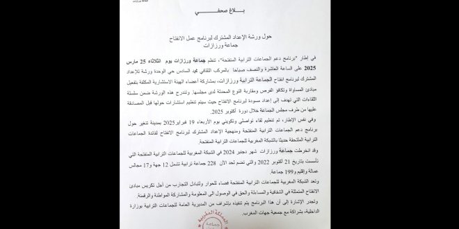 تنظم جماعة ورزازات يوم الثلاثاء 25 مارس 2025 على الساعة العاشرة والنصف صباحا بالمركب الثقافي محمد السادس حي الوحدة، ورشة للإعداد المشترك لبرنامج انفتاح الجماعة الترابية لورزازات.
