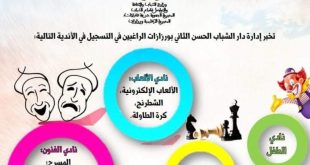 تخبر إدارة دار الشباب الحسن الثاني بورزازات الراغبين في التسجيل في الأندية التالية *نادي الفنون:المسرح؛الفنون التشكيلية؛الموسيقى والتعبير الجسدي. *نادي الألعاب:الألعاب الإلكترونية؛الشطرنج؛كرة الطاولة. *نادي البيئة والصحة. *نادي الطفل. للتسجيل والانخراط المرجو موافاة الإدارة بالوثائق التالية: 1) تعبئة إستمارة تأسيس نادي من طرف رئيس النادي والأعضاء (5أعضاء).يسحب من الإدارة. 2) نسخة من …