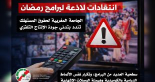 أعربت الجامعة المغربية لحقوق المستهلك عن استيائها الشديد من مستوى البرامج التلفزية التي تبثها القناتان العموميتان القناة الأولى المغربية والقناة الثانية دوزيم خلال شهر رمضان، معتبرة أن عددا كبيرا منها لا يرقى إلى انتظارات المشاهد المغربي ولا يعكس الدور الثقافي والإعلامي المنوط بالإعلام العمومي. وأوضحت الجامعة، في بلاغ لها صدر …